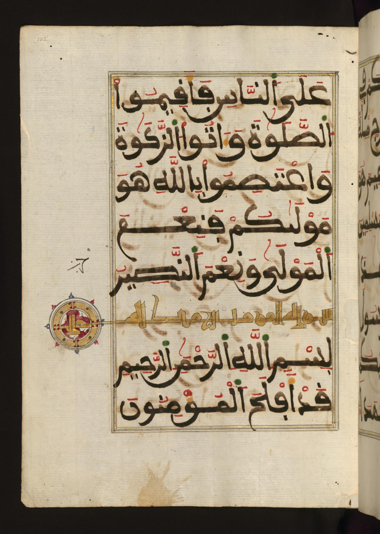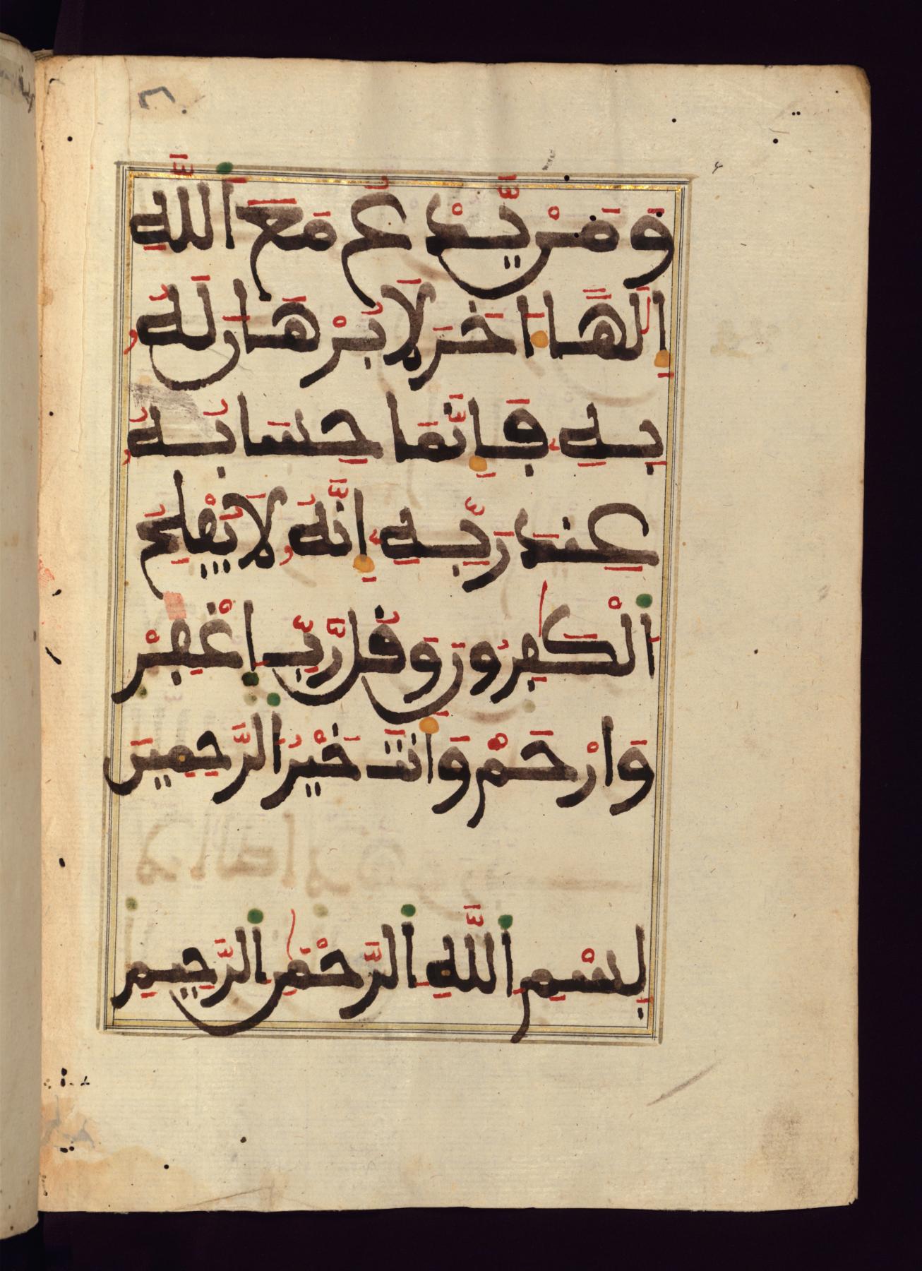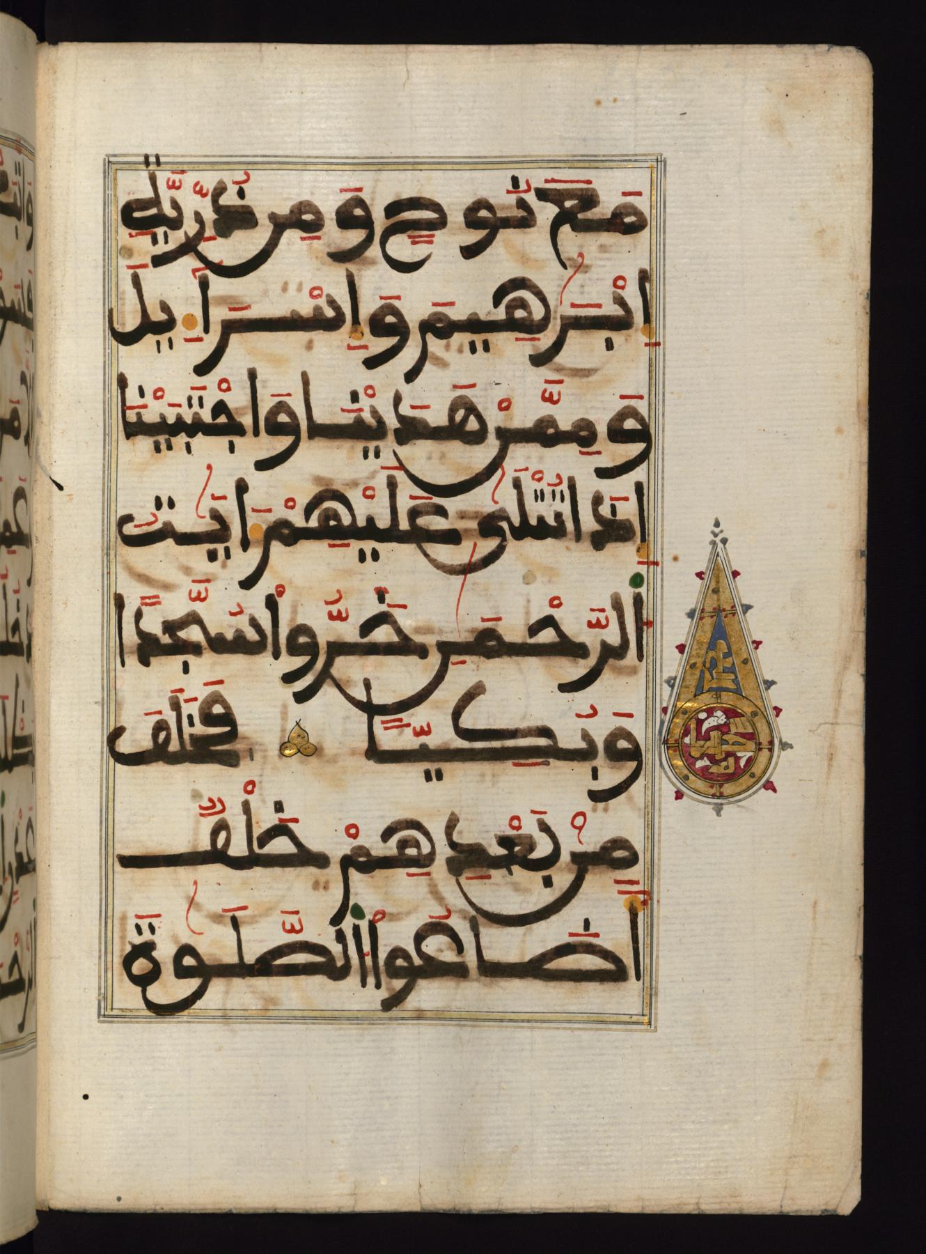 Эта рукопись из Худоственного Музея Уолтерса¹ , является фрагментом Корана, состоящим из глав с 19-го (Сурат Марьям) по 23-ий (Сурат аль-Му’минун). Издан он был в Магрибе и относится к XIII веку по хиджре / XVIII век. Текст написан в Марокканском стиле, с использованием красных, желтых и зеленных чернил, на итальянской бумаге.