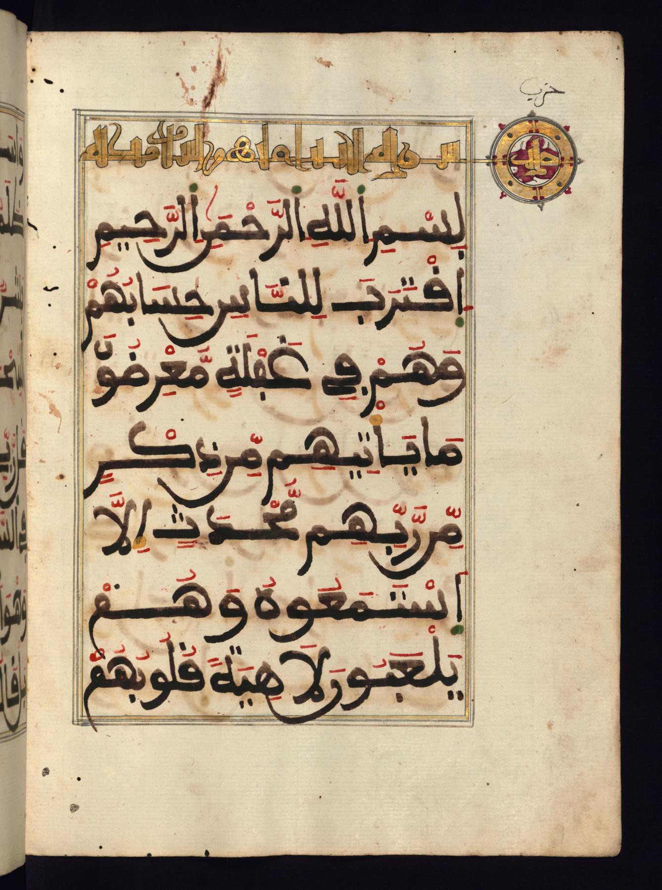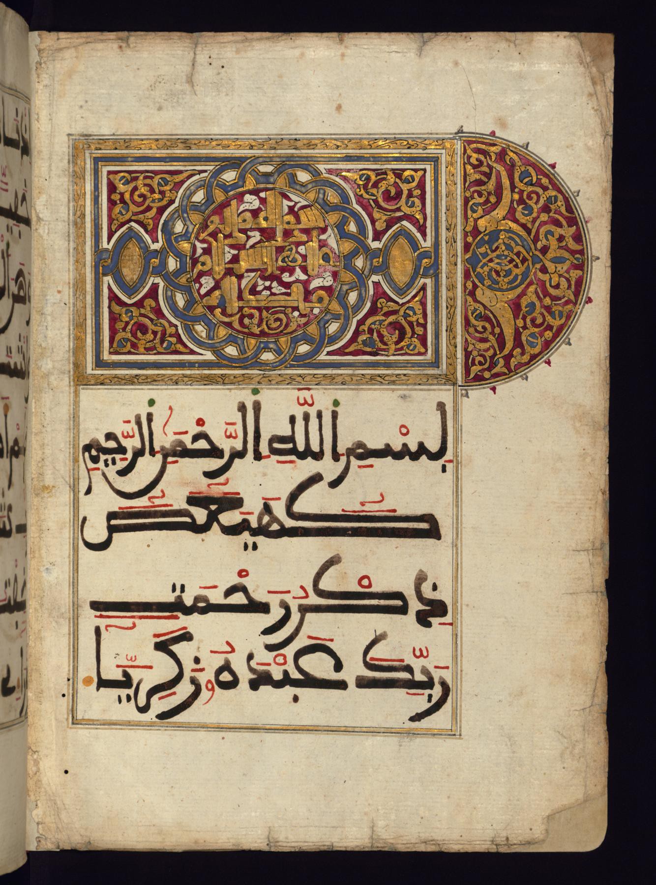 Рукопись начинается с декоративного оформления заголовка 19 -ой суры Марьям, написанный в Новом Аббасидском стиле (Сломанный Курсив) золотыми чернилами.